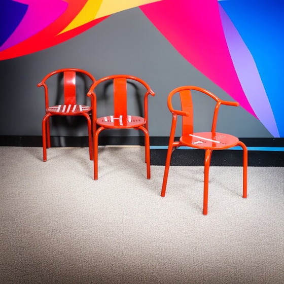 3x IKEA MAXMO vintage armchairs / dining chairs stackable made of metal in red Sweden 1980s 80s memphis