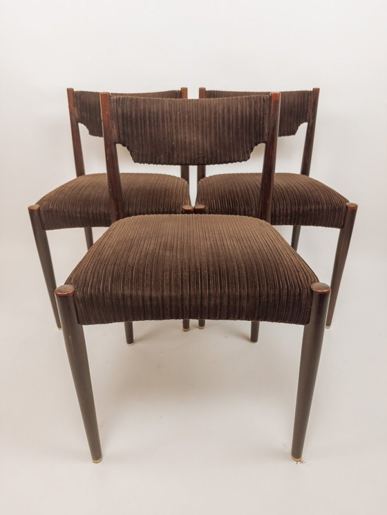 Set of three beautiful vintage dining chairs in dark teak. The chairs have a wonderfully soft seat and backrest made of brown corduroy. Some minor signs of wear here and there, but otherwise they are in excellent condition and very comfortable.