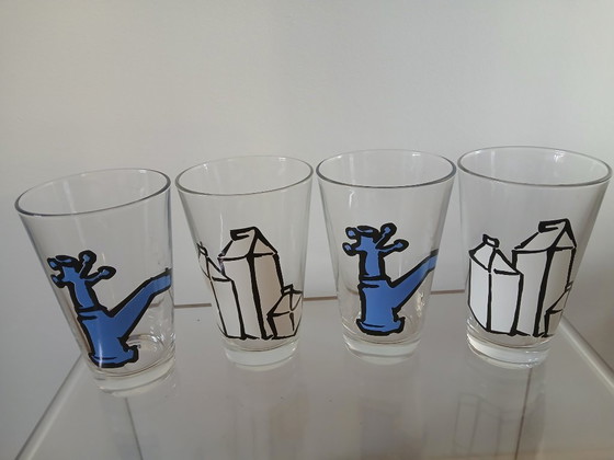 - Each glass features unique images: two with a blue tap and two with white milk cartons, creating a playful and contemporary look.