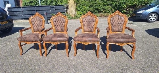 ConditionVery goodColorsBrownMaterialWood, LeatherNumber of items4Height107 cmWidth65 cmDepth62 cmSeat height55 cmSigns of usageStains