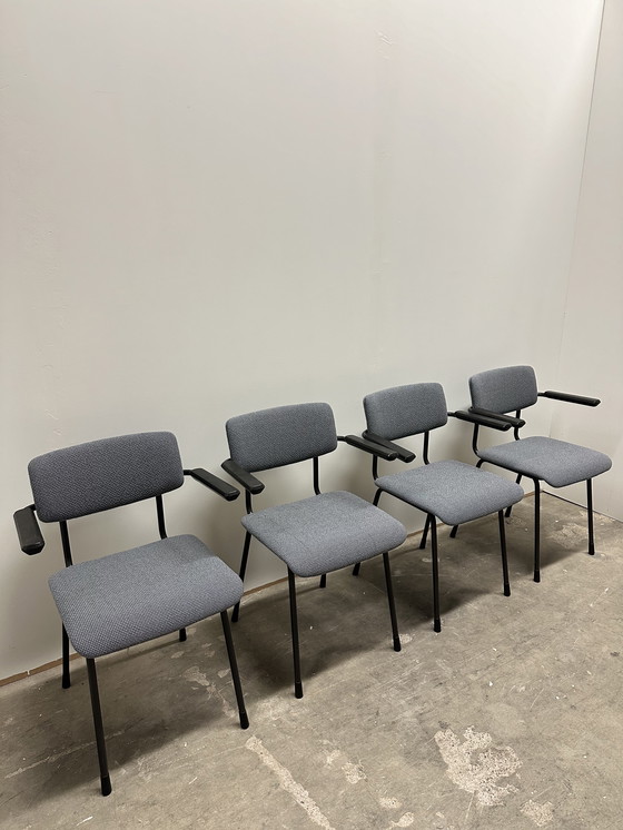 Four Gispen armchairs, model 1235/1236, with a black frame, black rubber feet, and black rubber armrests.