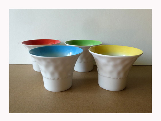 4 tealight holders by Rosenthal, Studio Line, Germany 2000s, white porcelain, colored rim inside. Mint condition - hardly used! Diameter top 7 cm, height 8.5 cm, weight 90 grams each. Gives very nice light and is also a nice decorative object or even usable as a dessert bowl! Private sale, no warranty, no return.