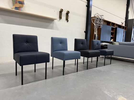 4 New Gelderland 7714 Dining chairs executed in Jumbo leather in the color blue.