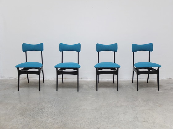 Lovely set of 4 ‘S3’ dining chairs designed by Alfred Hendrickx for Belform. These chairs are from Alfred’s early design period in the 50s where he was clearly inspired by Italian and Scandinavian designers. As such they feature an elegant black lacquered wooden frame with floating seats. Reupholstered with a funky blue fabric. The frames remain in excellent condition with small traces of use.