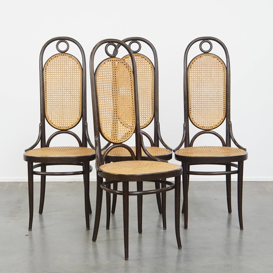 Offered this set of 4 tall vintage bentwood "Long John" Thonet design chairs.