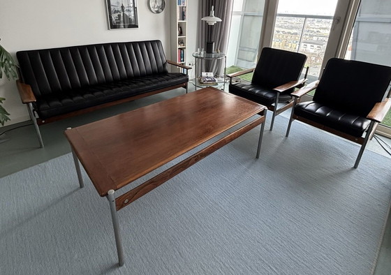 The 1001 series was first introduced in 1960. This still very nice set was bought in the early 1960s and consists of two armchairs, a three-seater sofa and a coffee table. There is a nice contrast between the materials used: the tubular steel, black leather and rosewood that balance the design nicely.