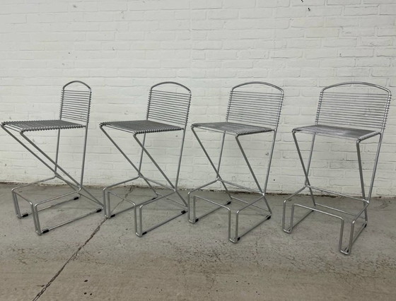 4 Vintage Postmodern bar stools / wire stools. Set of 4 stackable designer bar stools. These are made of chrome-plated metal.