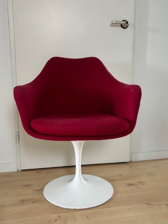 Authentic Tulip Saarinen swivel armchairs, fully upholstered in dark red Ploeg fabric. From the inheritance of an architectural firm, and they are wonderfully comfortable! I had them around the round dining table (which I no longer have), but they are also perfectly usable as armchairs. My elderly parents sat in them very comfortably!