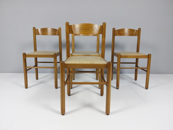 A set of four vintage wooden chairs with a warm, light brown finish and beige faux leather seats. These chairs have a timeless, simple design with round legs and a gently curved backrest, ensuring comfortable seating and a charming retro look. Their classic design makes them perfect for a retro interior, a dining room, or as a stylish focal point in a vintage setting.