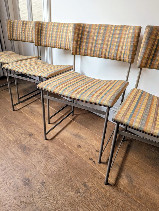 The chairs feature a slender steel frame (nickel-plated) with a curved rosewood veneer backrest and are further finished with a nice mixed-color upholstery.