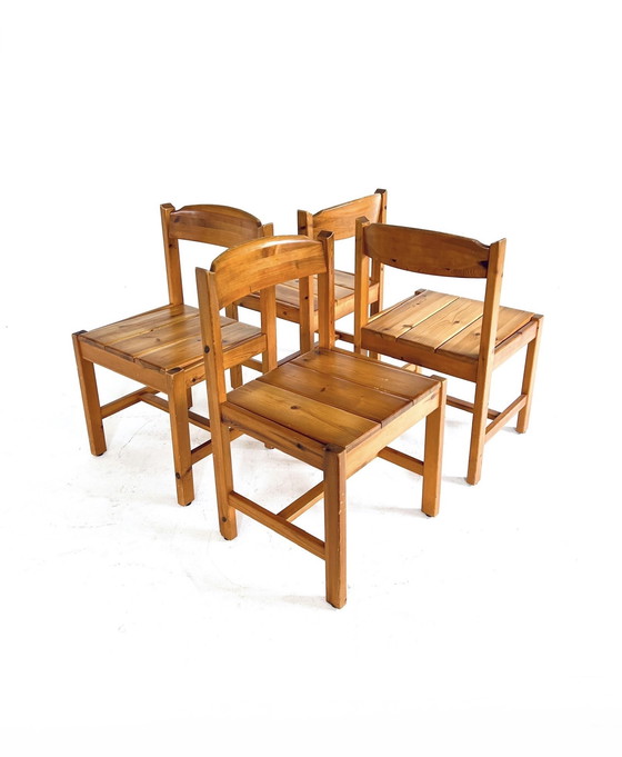 Beautiful solid pine dining chairs. Beautiful visible wood grain and warm pine color. Minimalist revealing design, unprecedentedly popular at the time.