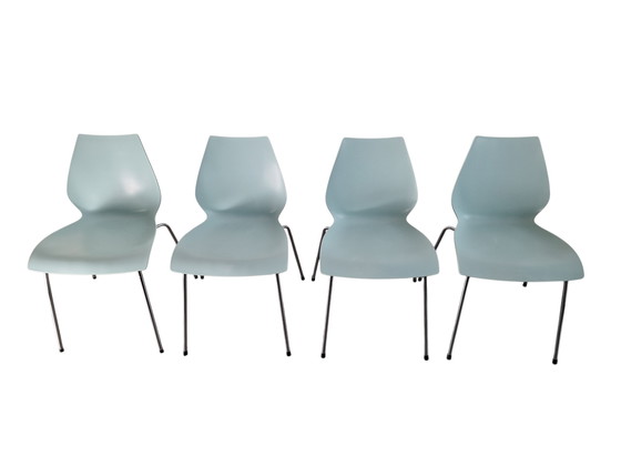This set of four Maui chairs, designed by Vico Magistretti for Kartell, features a sleek and contemporary silhouette. The polypropylene shell is a stylish light mint blue with a subtle pastel hue, while the slender chrome-plated steel legs create an elegant and airy look. The design perfectly reflects Magistretti's vision of effortlessly combining form, functionality, and versatility.