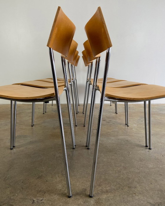 Beautiful chairs designed in 1992 by Johannes Foerson and Peter Hiort-Lorenzen. This set is from 1998; see the underside of the chair. This version has chrome legs. A nice detail is the way the wood is shaped around the metal frame on the back. The chairs are very comfortable.