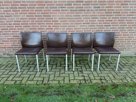 Set of 4 Leolux Myto dining chairs in brown leather. The chair base is made of anodized aluminum. Designed by Just Meyer.