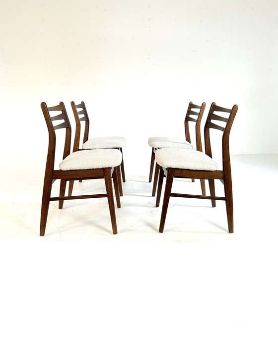 The chairs have been stripped of their old fabric and have fresh cold-foam padding. They have been reupholstered in a high-quality, creamy white Teddy fabric. The chairs have new underlays, giving them a fresh new look! The set is offered as a whole.