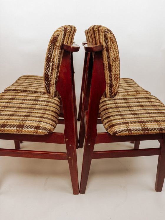 Set of two beautiful vintage dining chairs from the 1960s. The chairs have a solid teak frame and a woven checkered fabric seat and back. The chairs are still in excellent and sturdy condition, with one minor wear spot on the side of one of the chairs.