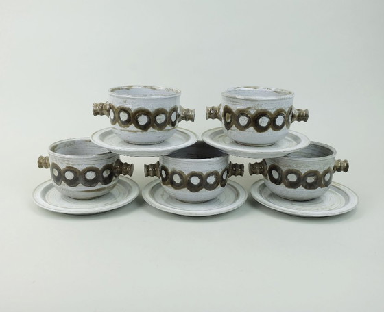 Five soup or cereals bowls with plates by Ceramano. The pattern is generally called "Tique" because it was previously sold under the name "Esthetique." In a 1972 book ("The Book of the New Table," see last photos), the tableware is called "Gala Sepia." Design by Gerda Heuckeroth, early 1970s. Material: stoneware.