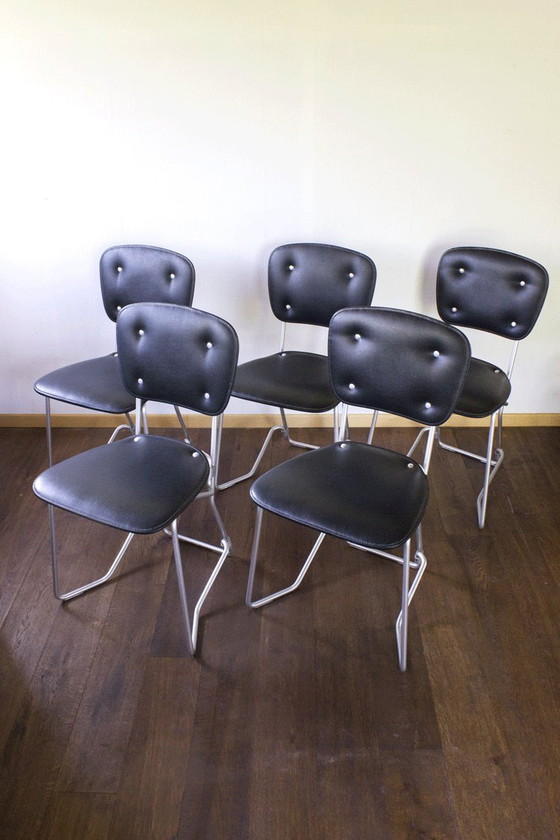 ConditionGoodColorsBlackMaterialAluminium, SkaiNumber of items5Height83 cmWidth48 cmDepth43 cmSeat height46 cmSigns of usageScratches