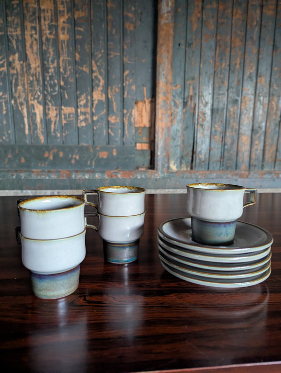 Set of 5 cups and saucers by Bing & Grøndahl in Denmark, designed by Jens Harald Quistgaard in the 1970s. Series: Tema.