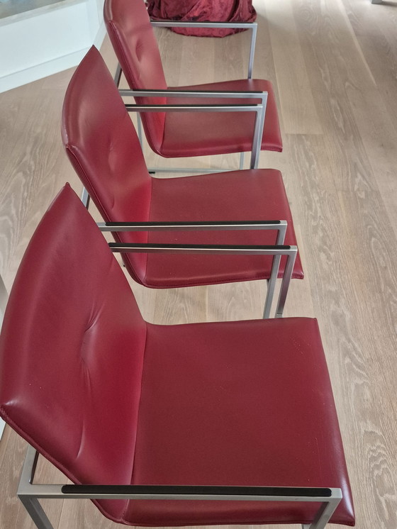This set of six Arco dining chairs offers a stylish and modern look for your dining room. The deep red leather seats combine beautifully with the sleek metal frame, creating a contemporary feel. Perfect for both formal dinners and cozy family gatherings. The chairs are in good condition, with only a few minor scratches on the seats that attest to their use. Add a touch of elegance to your interior with these beautiful Arco chairs.