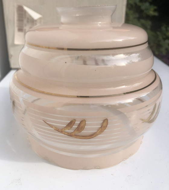 Magnificent glass shades from the early 1930s, in light pink - peach for the frosted opaline and gold parts. I thought it was Clichy pink, but it turns out it's probably glass from Boom - De Rupel, Belgium.