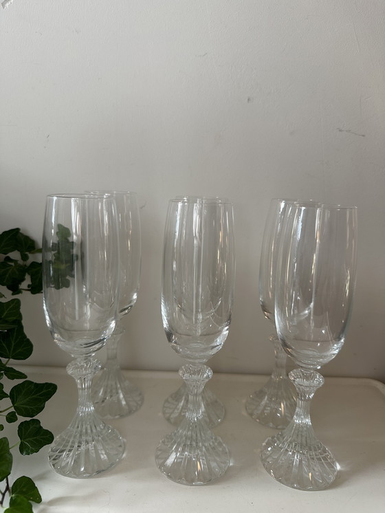 Super cool set of heavy crystal champagne glasses. Slender chalices on a beautifully shaped, sturdy base. Clear glass with a sleek look. Feels nice and heavy in the hand. G