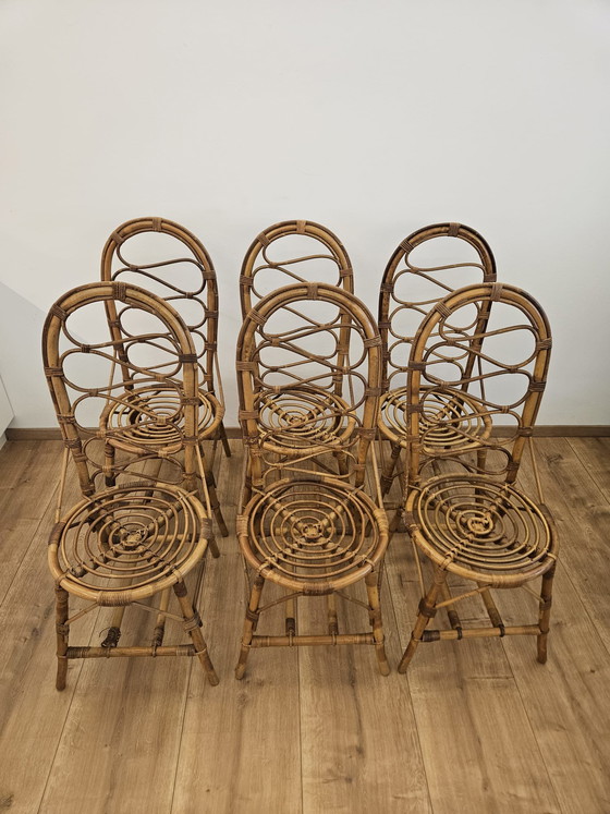ConditionGoodColorsBrownMaterialBamboo, RattanNumber of items6Height107 cmWidth44 cmDepth51 cmSeat height44 cm
