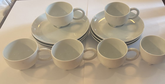 Presenting an exquisite set of six cups and saucers designed by Matteo Thun for Arzberg, a name synonymous with quality and elegance in porcelain craftsmanship. This collection embodies a minimalist aesthetic, perfect for those who appreciate understated sophistication in their tableware.