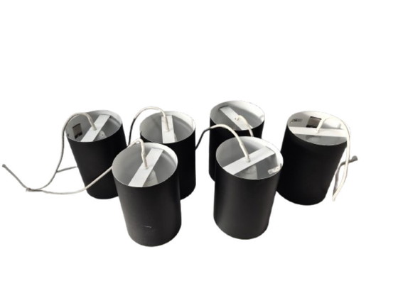 Six large 1950s/60s "pipe" pendant lights in black lacquered steel with a white interior and a 4cm gray band. The paintwork is in good condition. No cord covers. Diameter 14.5cm x height 21.5cm. Eila & John Meiling, model 16512. Manufactured by Louis Poulsen, made in Denmark. Manufacturer's mark present on each pendant.