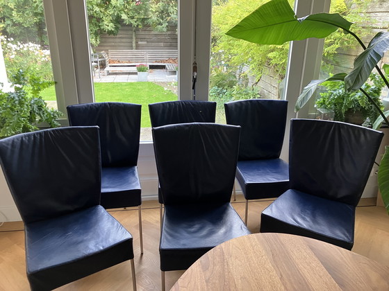 Six used Montis Spica chairs for sale, dark blue leather and brushed stainless steel frames. The leather shows some signs of wear. They can be lovingly restored and reupholstered.