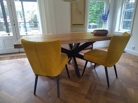 Set of 6 yellow dining chairs. The chairs have fabric (velvet) upholstery and black wooden legs. They are as good as new. I am selling these because they no longer fit very well in our new home. They are from Goossens and we have the invoice. They are now for sale at Goossens for 299 euros each. See photos.