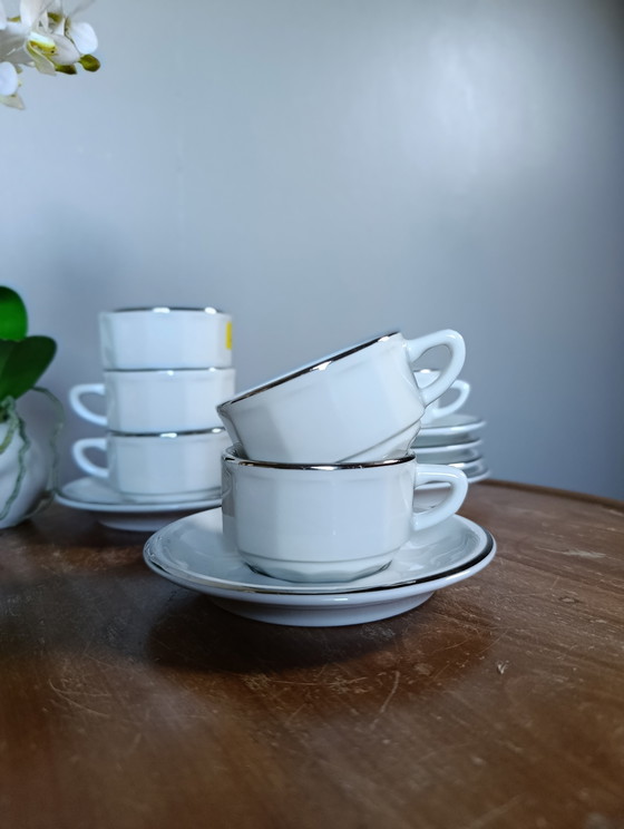 Discover the timeless elegance of the Flora Parisian bistro cups by Apilco Deshoulieres. These faceted white porcelain cups, adorned with a delicate silver rim, embody the classic charm of Parisian cafés.