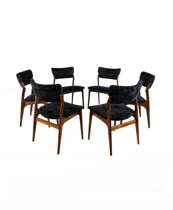 The set has been stripped of its old upholstery and features new Pantera cold foam filling. The set is upholstered in a high-quality Danish bouclé-style fabric in dark blue, Copenhagen 1316. This contrasts beautifully with the frame. In short, the set is like new again. Invoice for the upholstery available for inspection.
