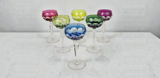 Set of 6 Val Saint Lambert colored crystal wine glasses. All glasses are signed and in good condition.