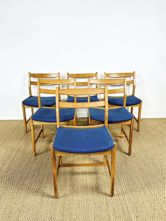 6 Scandinavian vintage oak chairs dating from the 1960s. Oak frame and blue fabric seat. Dimensions: H77.5 W45 D53