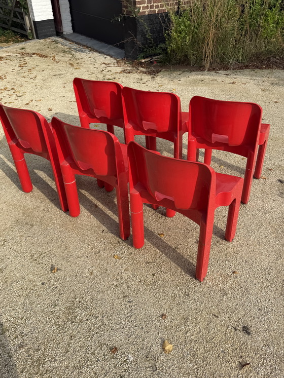 Introducing a set of six Colombo chairs, a striking addition to any modern interior. These chairs, with their bold red hue, are crafted from durable plastic, ensuring both longevity and style. Their sleek, minimalist design makes them a versatile choice for various settings, from dining rooms to contemporary office spaces.