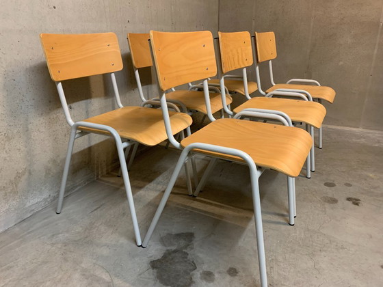 These 2005 industrial chairs are in new condition and have a nice light appearance. They are easily stackable,but due to stacking they sometimes have a small paint damage on the inside of the legs.Otherwise, the chairs are immaculate, in NEW STATE. The chairs are 80 cm high, 45 cm wide, 54 cm deep and have a seat height of 45 cm