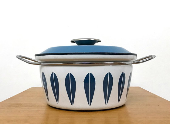 Beautiful and charming enamelled Lotus frying pan with original lid, produced in the 1960s by the Norwegian enamel company Cathrineholm. The company produced a variety of utility ware over the decades. Their most successful line came to market in the 1960s with the popular "Lotus" series, a Mid-Century Modern design. The main artist behind Cathrineholm's Lotus enamel work was Grete Prytz Kittelsen. She designed the shapes and colours of the bowls, and Arne Clausen designed the iconic lotus leaf that the factory added around 1963.