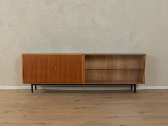 Wonderful sideboard from the 1960s. Corpus in walnut veneer with two doors, two sliding glass doors, one shelf, one glass shelf, and new square steel feet in black. The top has been coated with black Formica. Made in Germany.