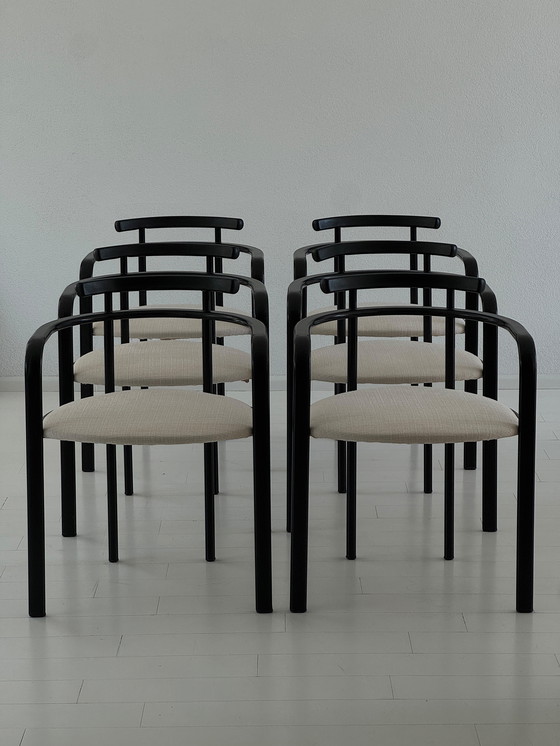 Introducing a set of six 80s dining chairs designed by Carlo Bambino for Martina, under the renowned brand Segis. These chairs are a perfect blend of modern design and functionality, ideal for enhancing any dining space with a touch of elegance.