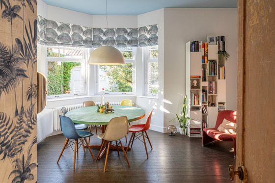 These chairs are the original vintage chairs, four of which were produced by Herman Miller. Four of them have the logo and possibly a sticker. The chairs are 50 years old, so naturally they show signs of wear, but they are still in excellent condition. They are used daily in our dining room. Selling due to a move. A table is also available if desired: leg from a vintage Danish table, tabletop in green Mortex. P.O.A.