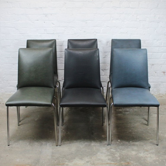 Set of 6 "Robert" model chairs by Pierre Guariche for Meurop. Produced between 1958 and 1975. Wooden structure covered with skai, 2 black, 2 bottle-green and 2 blue-gray chairs, chromed steel legs.