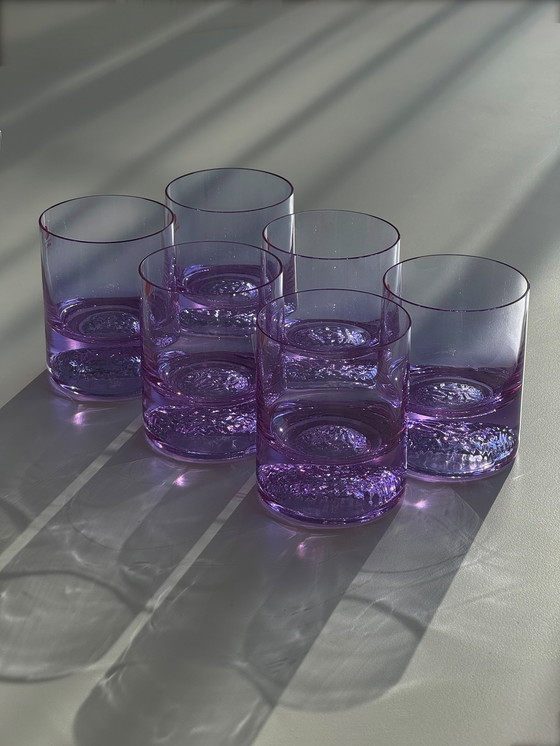 Set of 6 exquisite water or whisky glasses from Cristalleria Vecris, Italy, dating back to the 1970s. These glasses feature a stunning purple hue and are crafted from high-quality glass, showcasing the elegance and style of the era. Perfect for adding a touch of vintage charm to your glassware collection.