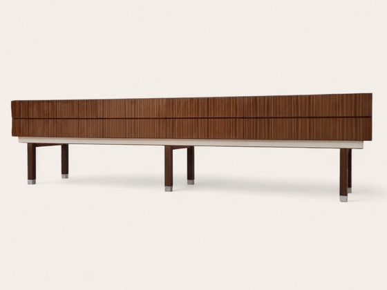 This stylish lowboard from the 70s has a beautiful Scandinavian look thanks to its sleek design and warm walnut-look veneer. The slender iron feet beneath the wooden legs give the cabinet a rugged and modern accent.