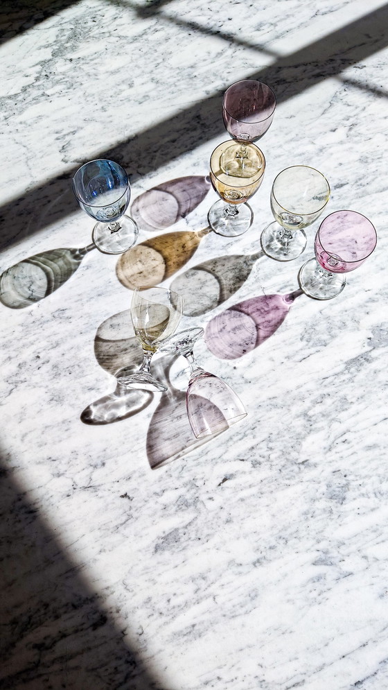 Set of 7 vintage wine glasses in different colors from Schott zwiesel model Neckar
