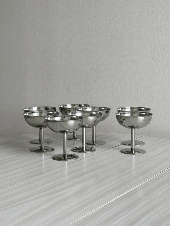 Set of 8 elegant pedestal bowls in stainless steel, ideal for presenting desserts, ice cream, fruit or aperitifs in style. These bowls add a chic, timeless touch to your table for refined meals or special occasions. Perfect for the art of entertaining, they'll seduce your guests with their brilliance and vintage design. A great gift idea for lovers of elegant and original table decoration.