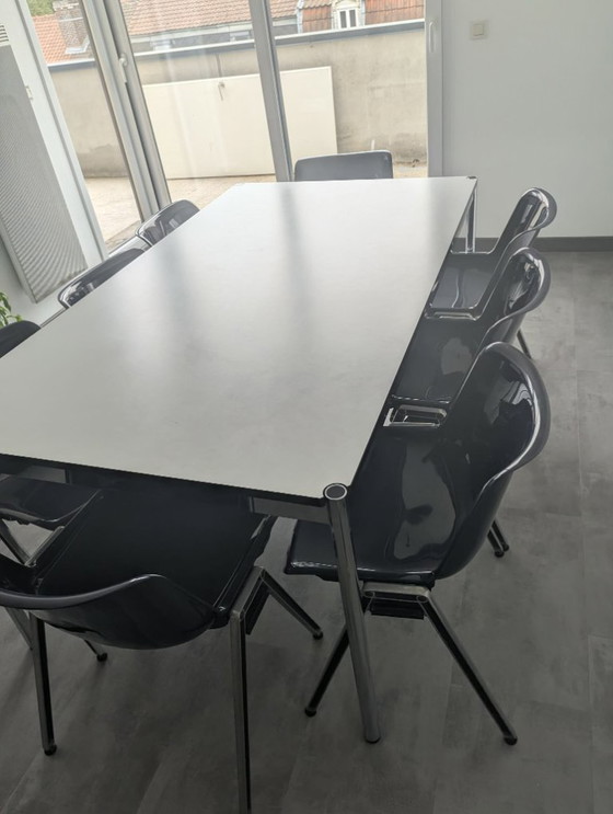 8 chairs and a table by Tecno - Vintage design The set is in very good condition, only one table leg is damaged (see photo).