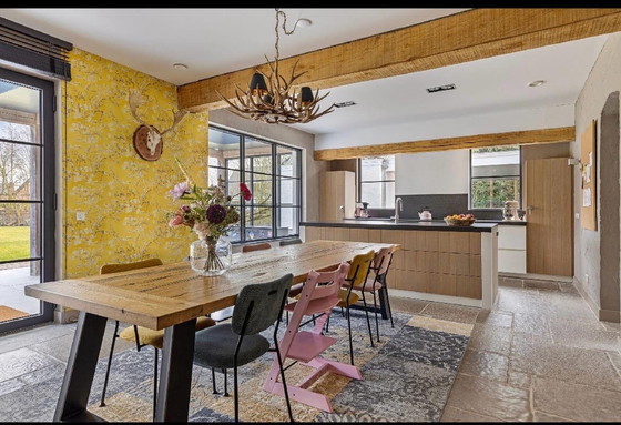 Beautiful robust table with tough oak top finished with steel frane. Comes from 't Looierhuis Chaam.