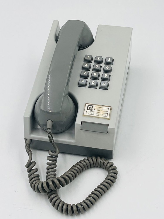 Iconic 80s telephone with minimalist lines. Two-tone gray. Belgian RTT Dimensions : 21 x 14 x H12 cm.