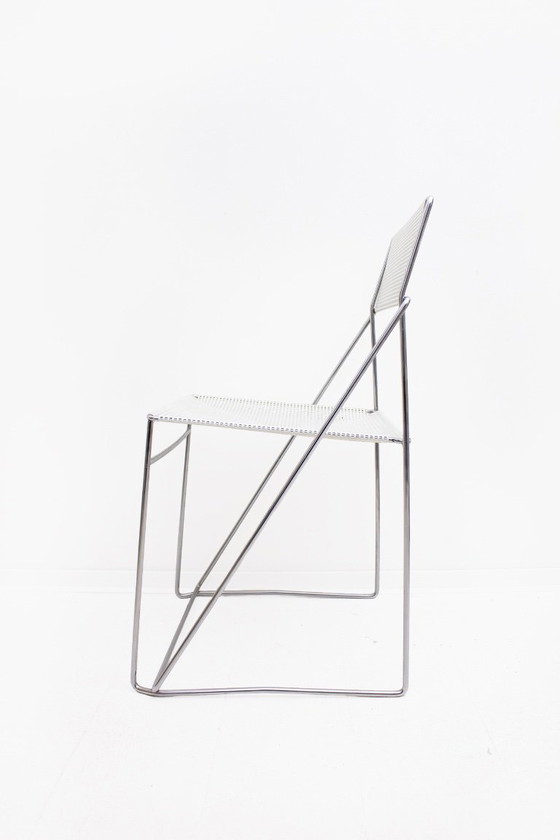 This beautiful, minimalist chair, called Omli, is from the Nova X-Line series, designed by Niels Jørgen Haugesen for Danish furniture manufacturer Hybodan A/S. The first design, the 'X-Line,' was launched in the late 1970s and embodies the timeless minimalism of Scandinavian design. Haugesen then launched this improved version in the 1980s, the 'Nuova X-Line.' The chair features a chrome-plated metal frame and a perforated white metal seat and backrest.
